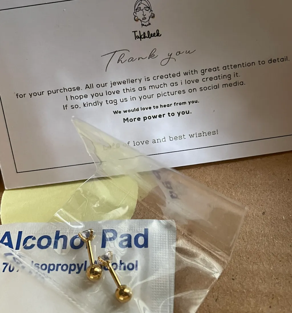 I am leaving this review after 17 days of using stud on a freshly pierced area, and honestly i would have not come back and dropped this review if it was not this good. I always had tough time with piercings. My nose pierciNg took me 7 months to heal. For flat area (top) i used takhleeq stud, and middle one is gold and both of them were pierced together. The flat one is better and showed no signs of irritation, in fact the one I got changed with gold sometimes hurt a little. In fact, i expected a hard time because of my skin sensitivity but I am amazed… i will definitely shop more. I am super super happy with how it amazing the quality is. I will suggest if u can have a little longer stud rods for fresh piercings that would be great. However, this length worked fine too but i was scared of it getting embedded in skin. But, it didn’t